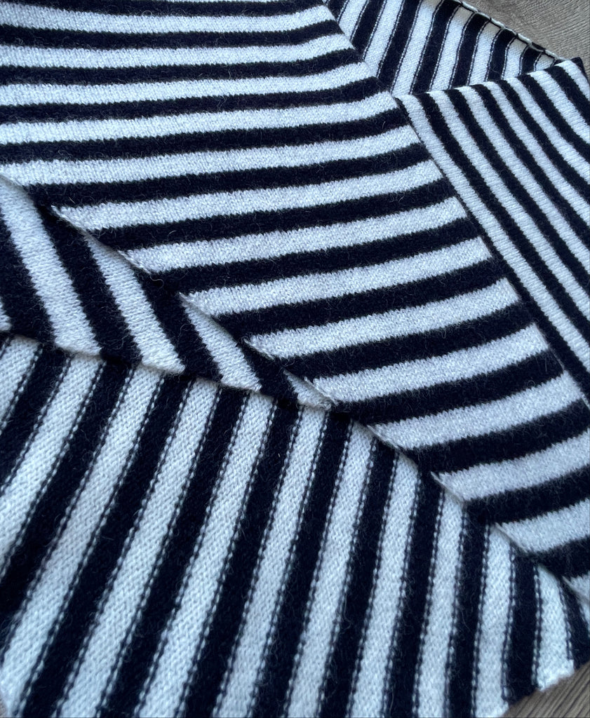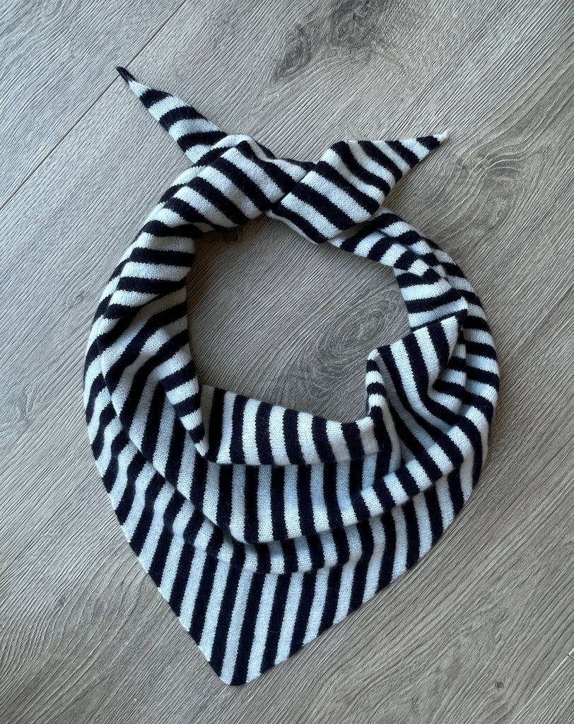This chic triangle scarf features a striking combination of navy blue and ecru stripes, offering a sophisticated contrast that complements any wardrobe. Knitted from the finest merino lambswool, it’s incredibly soft and lightweight, providing warmth and comfort without the bulk. The bold stripe pattern adds a contemporary touch to its classic design, making it a versatile accessory for both everyday wear and special occasions. Whether draped over a coat or layered with a sweater, this scarf effortlessly elevates any outfit with its timeless elegance and luxurious feel.